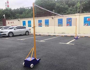 - Мобильная система из двух стоек с противовесными основанием и колесами для легкого перемещения по площадке.