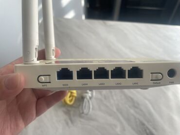 - В комплекте на фото: роутер, сетевой кабель (жёлтый), телефонный/патч‑шнур (серый)