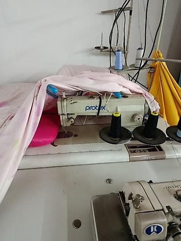 - Прямая стачивающая машина Protex на общем столе с нитедержателем под несколько катушек. Предусмотрены катушки черных и голубых нитей, удобная широкая рабочая поверхность с разметкой.
