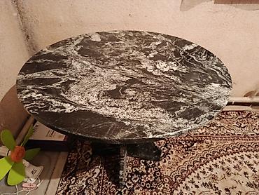 Круглый стол из камня (вероятно, мрамор/гранит) с выразительной черно‑серой текстурой.