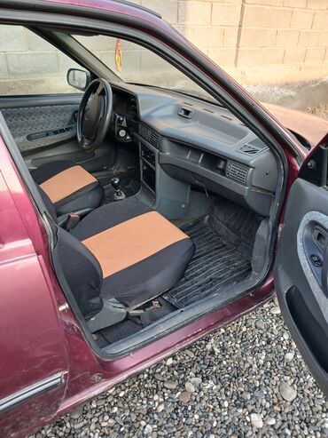Автомобиль седан с открытым капотом, демонстрирующим двигатель внутреннего сгорания. Салон оборудован тканевыми сиденьями с двухцветными чехлами черного и коричневого/бежевого цвета. Присутствует ручная коробка передач. Автомобиль имеет четыре двери, а его внешний цвет — бордовый или темно-красный. В моторном отсеке видны аккумулятор, бачки для жидкостей и элементы системы впуска.