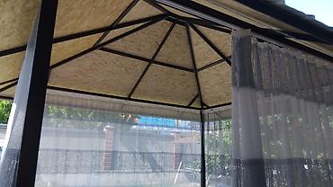 Тапчан - Каркас: металлический, темного цвета, устойчивая конструкция на четырех опорах. - Крыша: двускатная, из профнастила/листового материала; по периметру дополнительно набиты планки для тенев...