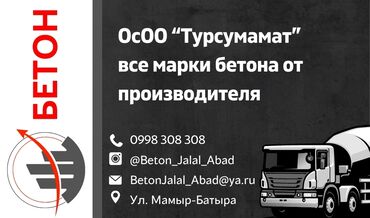 Продажа и доставка бетона любой марки. От производителя ОсОО Бишкекский бетонный завод. ББЗ. На рынке 6 лет. Доставка День в день. В любом количестве. Качество % Своя лаборатория Адрес: Ауэзо...