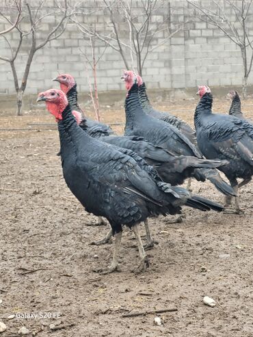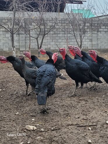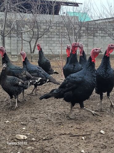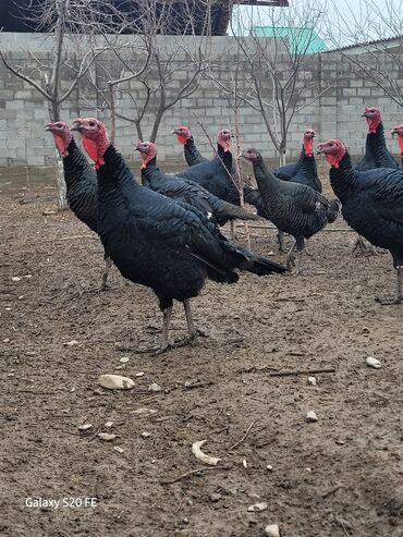 - Порода/тип: тяжёлые чёрные индюки (самцы и самки), характерный чёрный глянец пера, красные бородки и серёжки.