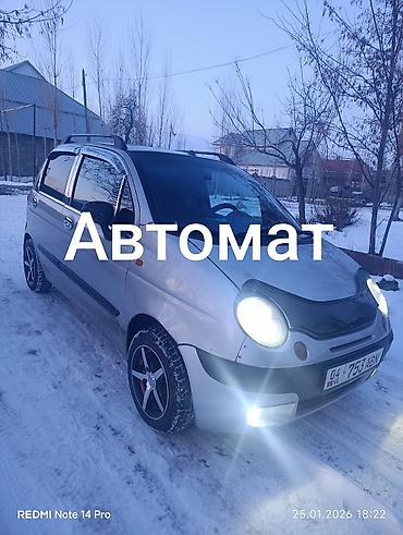 Daewoo Matiz, 5‑дверный хэтчбек, серебристый цвет, на кыргызских номерах. Компактный городской автомобиль с экономичным бензиновым мотором и автоматической коробкой передач.