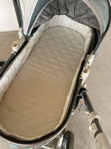 Универсальная детская коляска серого цвета с люлькой, предназначенная для комфортных прогулок. Модель оснащена прочной рамой и четырьмя колесами для устойчивости и маневренности. Внутренняя часть люльки отделана светлой стеганой тканью, обеспечивающей уют для ребенка. Капюшон коляски регулируется, предоставляя защиту от солнца и ветра. Удобные ручки обеспечивают легкость управления. Под люлькой расположена корзина для хранения вещей или покупок. Коляска подходит для повседневного использования и прогулок на свежем воздухе.