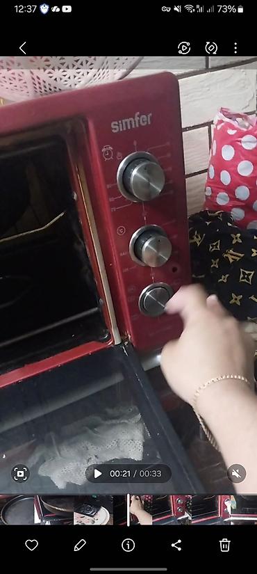 Подходит для выпечки, запекания, разогрева и приготовления блюд в формах и на противне. Корпус в ярком красном цвете, бренд Simfer отображён на фронтальной панели.