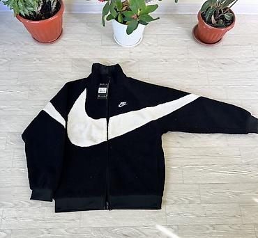 - 2 в 1: одна сторона — гладкая черная нейлоновая ветровочная ткань с небольшим логотипом Nike на груди; вторая сторона — мягкий флисовый/шерп‑флис черного цвета с крупным контрастным белым Swoosh по всей передней части и рукавам.