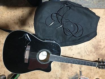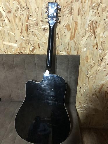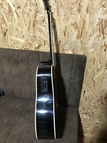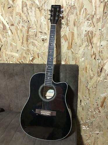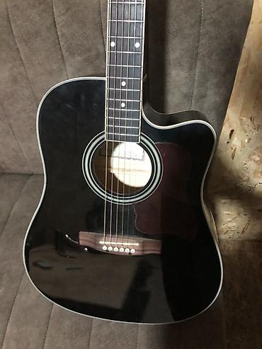 - Корпус: форма dreadnought с вырезом cutaway, глянцевый чёрный цвет, окантовка по краю.