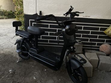 Электроскутер городского типа, компактный и бесшумный. Черный матовый цвет, классическая рама с широкой платформой для ног. Два сиденья: основное и заднее с мягкой спинкой для пассажира. Амортизаторы сзади, передняя вилка с пружинной подвеской для комфортной езды по неровным дорогам.