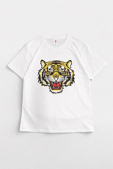 - Яркий графический принт головы тигра по центру (желто‑черные оттенки, красные акценты)