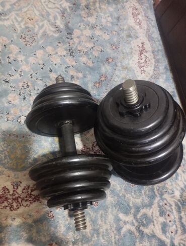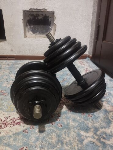 Гантели+ штанга. общий вес 39 кг. разборный. можно регулировать вес. 5 кг. новые. производство Россия перчатки в подарок. Г. Бишкек, ул. Куренкеева 74.