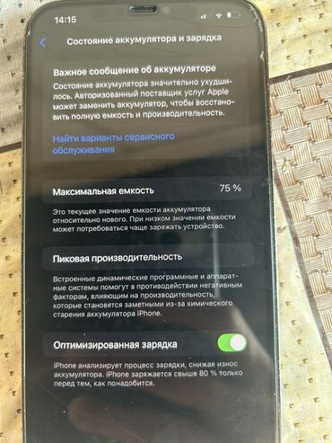 - Состояние аккумулятора по меню «Состояние аккумулятора и зарядка»: максимальная ёмкость 75%, отображается важное сообщение о необходимости сервиса; пиковая производительность поддерживается встроенными системами