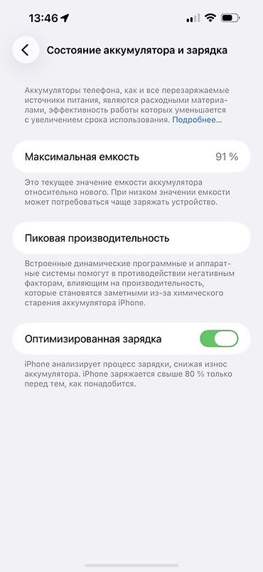 - Аккумулятор: максимальная емкость 91% (скриншот в галерее), включена оптимизированная зарядка