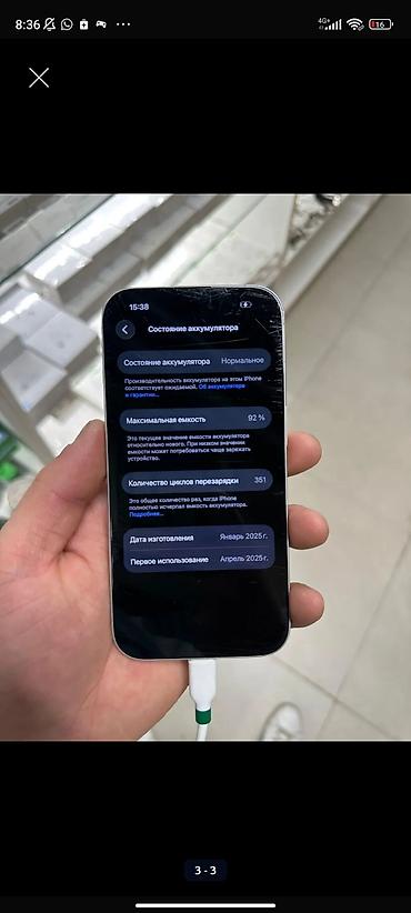 - Батарея: максимальная ёмкость 92%, количество циклов перезарядки 351.