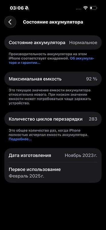 - Аккумулятор: состояние «Нормальное», максимальная ёмкость 92%, количество циклов перезарядки 283