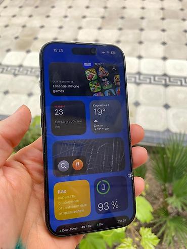 Дополнительно на экране виден процент заряда 93%. На фронтальном стекле присутствуют заметные трещины/сколы в нижней части и поверхностные царапины. На камерах установлены защитные накладки. Цвет и логотип Apple соответствуют версии Pro.