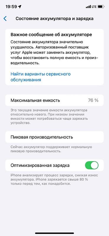 - Аккумулятор: максимальная ёмкость 76%, включена «Оптимизированная зарядка». В разделе «Состояние аккумулятора и зарядка» отображается сообщение о необходимости замены для восстановления полной ёмкости и производительности.