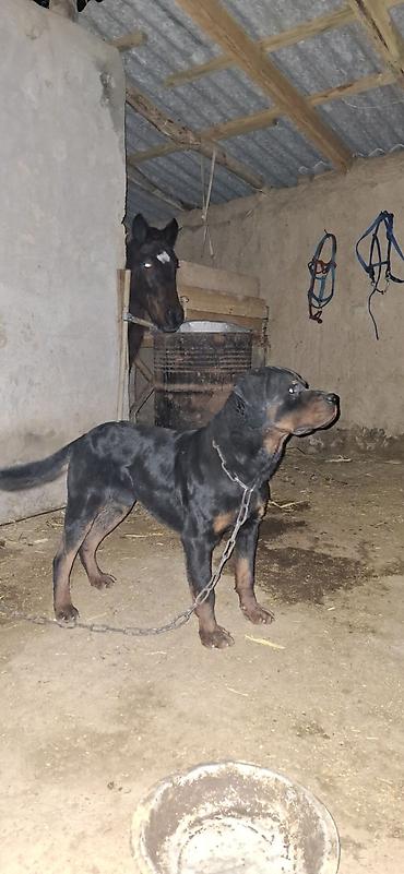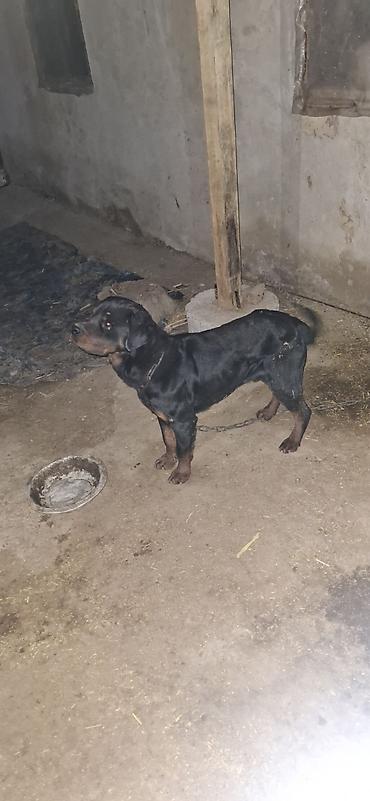 Ротвейлер, кобель. Классический окрас: черный с ровными подпалинами. Мощный костяк, широкая грудь, крепкая шея, плотная короткая шерсть с хорошим блеском. Хвост купирован. Уравновешенный темперамент, внимательный и контактный, охранные качества выражены. Привык к цепи/вольеру, уверенно реагирует на посторонних, держит территорию. Базово управляем, откликается на хозяина, ориентирован на работу.