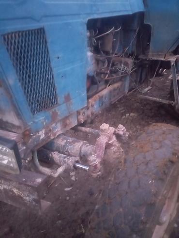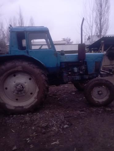 Трактор колесный с кабиной, синий, с навесным плугом.