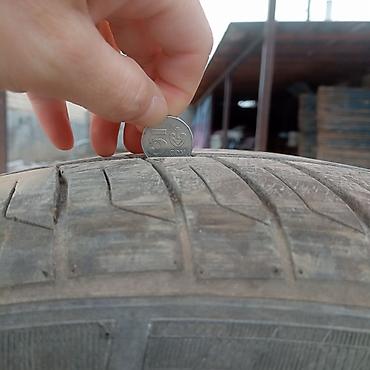 - На фото — замер глубины протектора монетой для наглядности