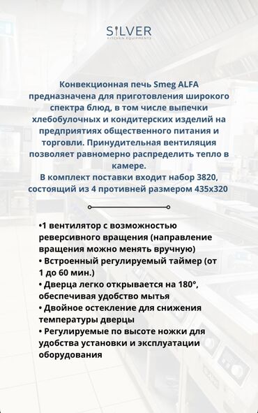 Печь конвекционная Smeg ALFA43X - Тип: конвекционная - Управление: электромеханическое - Комплектация: 4 противня 435×320 мм - Вентиляция: 1 вентилятор - Температурный диапазон: 50–250 °C (термост...