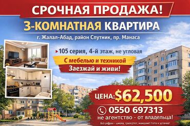 Продам! 3к.кв, 105с, Джал-23, 93т$ Можно сразу заселиться после переоформления, Отличный вариант, подходит в ипотеку! Юридически чистые документы, Ориентир Школа-Гимназия №72 Общая площадь 62м2+ 2...
