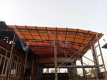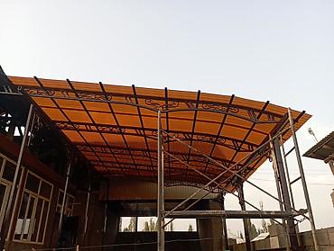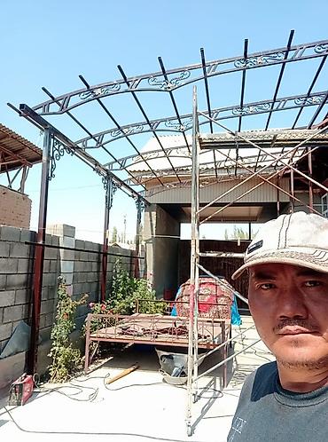 - Изготовление и монтаж навесов/козырьков над дворами, въездами и террасами. Арочные каркасы из профильной трубы с художественной ковкой, декоративными элементами и ребрами жесткости. Крыша из профнастила/поликарбоната (на фото — профлист с защитным покрытием, скрытый крепёж).