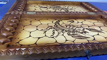 - Двусторонняя игровая доска: снаружи — поле для шашек/шахмат с объёмным геометрическим орнаментом и нумерацией клеток по краю; внутри — поле для нард с выжженным рисунком скорпиона и «каменной» фактурой.