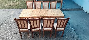 - Состав: массивный прямоугольный стол на деревянном каркасе и 8 стульев с мягкими сиденьями и спинками.