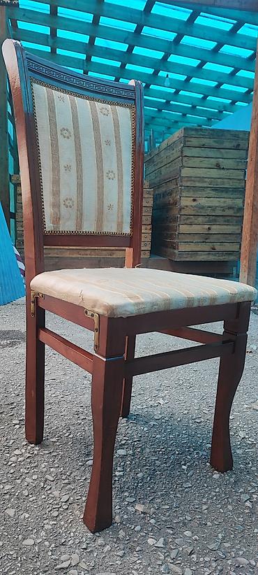 - Материалы: натуральное дерево; сиденья и спинки стульев обиты тканью с бежевыми вертикальными полосами и декоративным узором; по периметру спинки — окантовка мебельными гвоздиками.