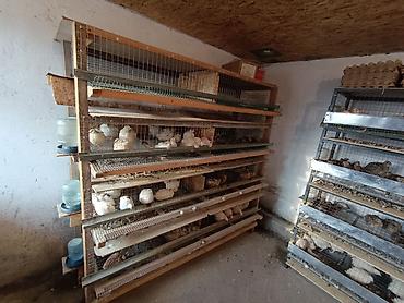 - На фото — взрослые птицы в клетках с бункерными кормушками и поилками.