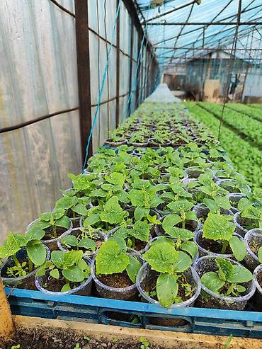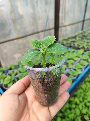 - Сеянцы огурца, выращенные в теплице в индивидуальных пластиковых стаканчиках с питательным субстратом.