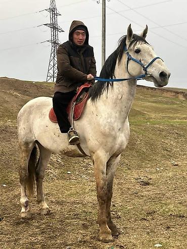 Лошадь-серая в яблоках, высокий статный жеребец под седлом.