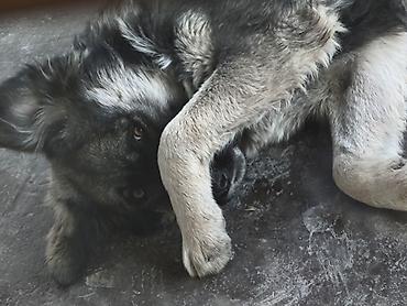 Щенок крупной породы, пушистая, с густой двуслойной шерстью серо-черного окраса с кремовыми подпалинами. Выразительные янтарные глаза, широкая морда, плотный костяк, мощные лапы. Уши полустоячие, слегка завернуты.