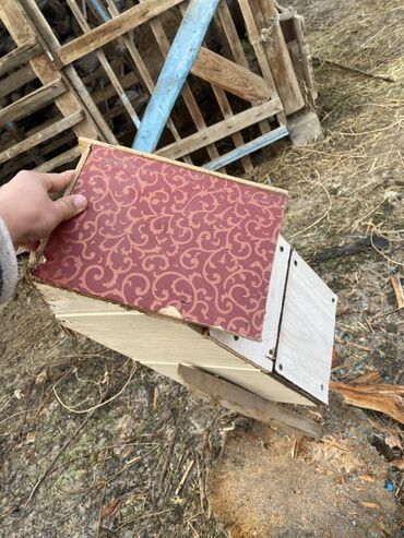 - Материал: листы ДСП/фанеры, собраны на саморезы. Крыша декорирована бордовыми планками с узором.