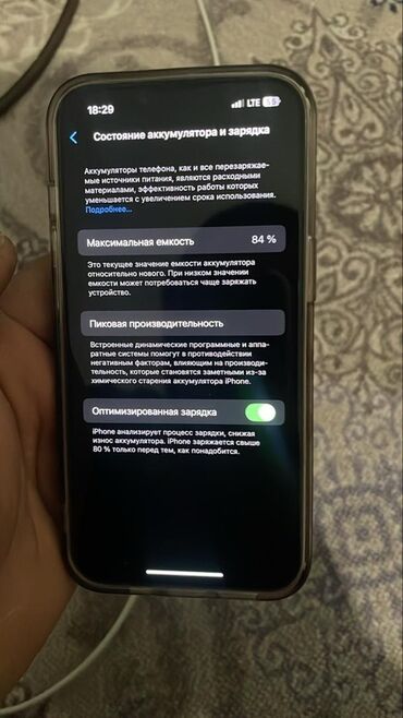 - Аккумулятор: максимальная ёмкость 84% (скрин из «Состояние аккумулятора и зарядка»), активна «Оптимизированная зарядка».