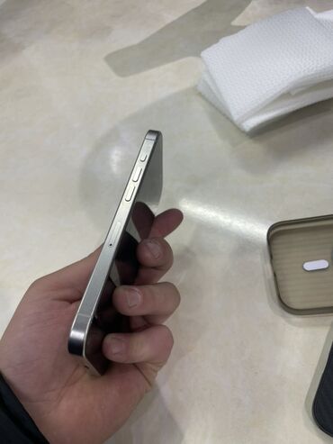 IPhone (линейка Pro), цвет серебристый/белый. Плоские грани из металла, стеклянная задняя панель с логотипом Apple. Блок из трёх камер с вспышкой и сканером LiDAR, установлен прозрачный защитный бампер/рамка на объективы.