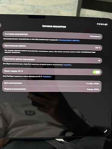 - Аккумулятор: максимальная ёмкость 100%, количество циклов перезарядки 16; лимит заряда 80% включён.