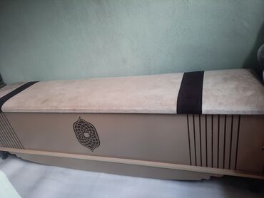 - Лавка-пуф у изножья с мягким сиденьем из светлой ткани и декоративными темными вставками; корпус с резным орнаментом, подходит как банкетка или бельевой ящик.