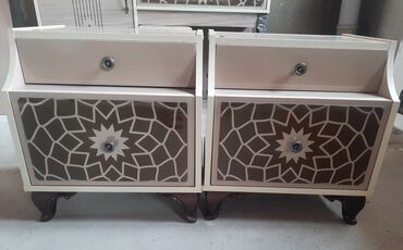 - Тумбы прикроватные (в комплекте 2 шт., подпись на фото) с распашными дверцами, фигурными металлическими ручками и орнаментальным рисунком на фасадах.