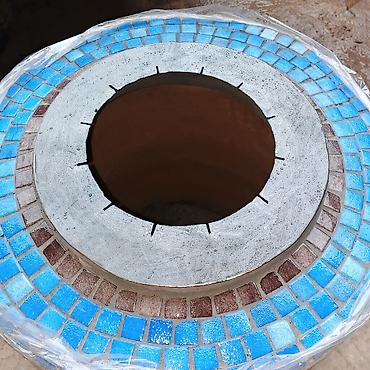 - Верхняя горловина усилена бетонным/огнеупорным пояском с декоративной облицовкой мозаичной плиткой (оттенки синего и коричневого).