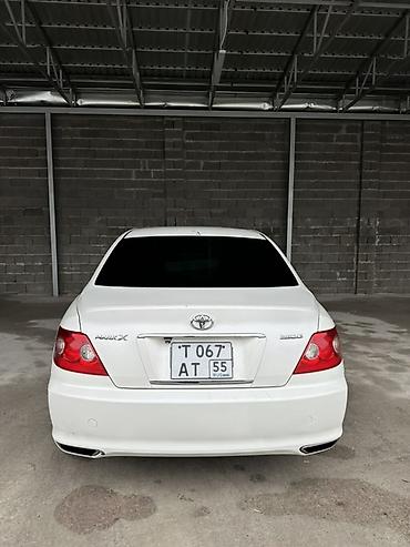 Toyota Mark X, седан, правый руль. Белый цвет, тонировка по кругу. Заводская эмблема Mark X на крышке багажника. Двойной выхлоп, светотехника с круглыми задними фонарями, передняя оптика с линзами. Легкосплавные диски, штатные боковые зеркала с повторителями, дверные молдинги в цвет кузова. Аккуратный аэродинамический обвес по кругу: передний и задний бамперы с низкими юбками, пороги. Ровные зазоры кузова, стекла без видимых трещин. Номера региона 55 (РФ). Просторный салон на пять мест, отдельные задние подголовники. Отлично подходит для городской езды и трассы: классический задний привод Mark X, сбалансированная подвеска, комфорт и управляемость бизнес-класса.