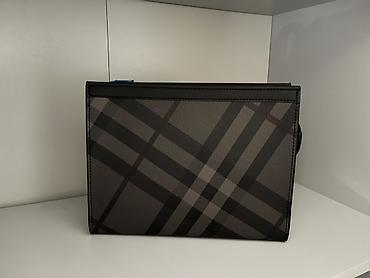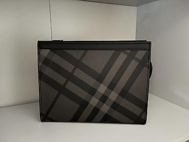 Клатч/папка на молнии, формат около A4. - Материал: черный искусственный/прессованный материал под кожу с водоотталкивающей фактурой. - Дизайн: темно-серый повторяющийся монограмный узор по всей по...