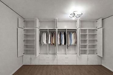 - Боковые секции: открываемые шкафы с регулируемыми полками для свитеров, белья, коробок, обуви.