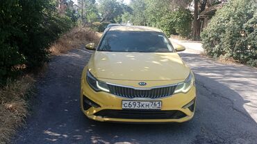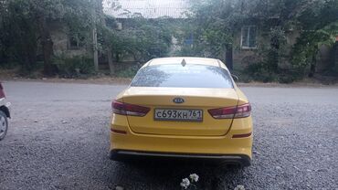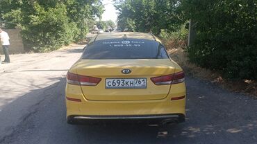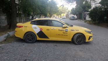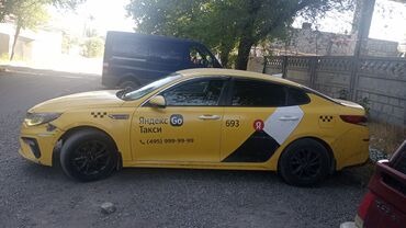 Желтый седан Kia Optima, предназначенный для использования в качестве такси. Автомобиль оснащен заметными элементами брендинга "Яндекс Go Такси" на боковых сторонах кузова, что указывает на его принадлежность к сервису такси. На кузове также присутствует номер "693" и контактные данные. Модель отличается характерной для Kia решеткой радиатора и современными фарами со светодиодными дневными ходовыми огнями. Черные диски дополняют внешний вид автомобиля. Этот автомобиль является практичным решением для городских перевозок.