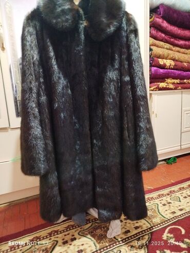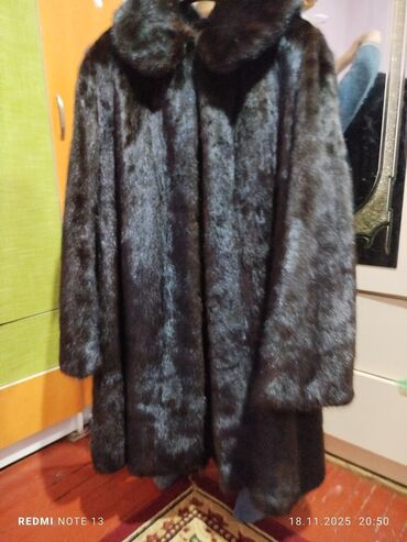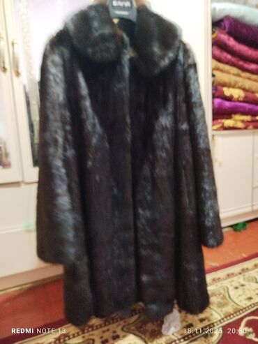 Длинная шуба из темного меха (визуально — норка/собольного типа), классический свободный крой.