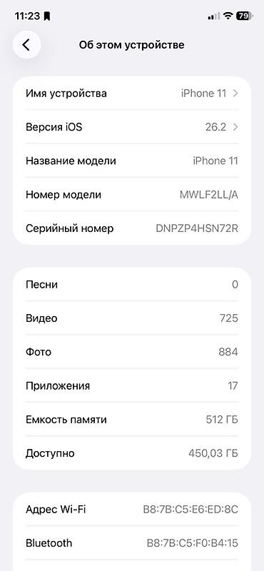- Память: 512 ГБ (доступно ~450 ГБ на скриншоте)