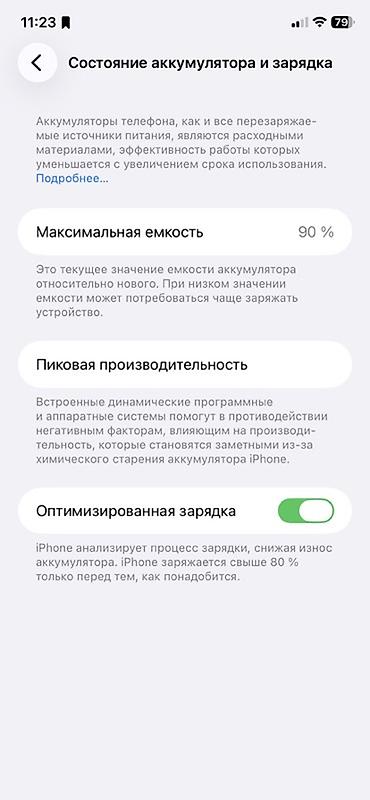 - Аккумулятор: максимальная емкость 90%, включена оптимизированная зарядка
