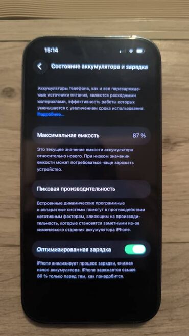- Аккумулятор: максимальная емкость 87% (оптимизированная зарядка включена — видно на скриншоте)
